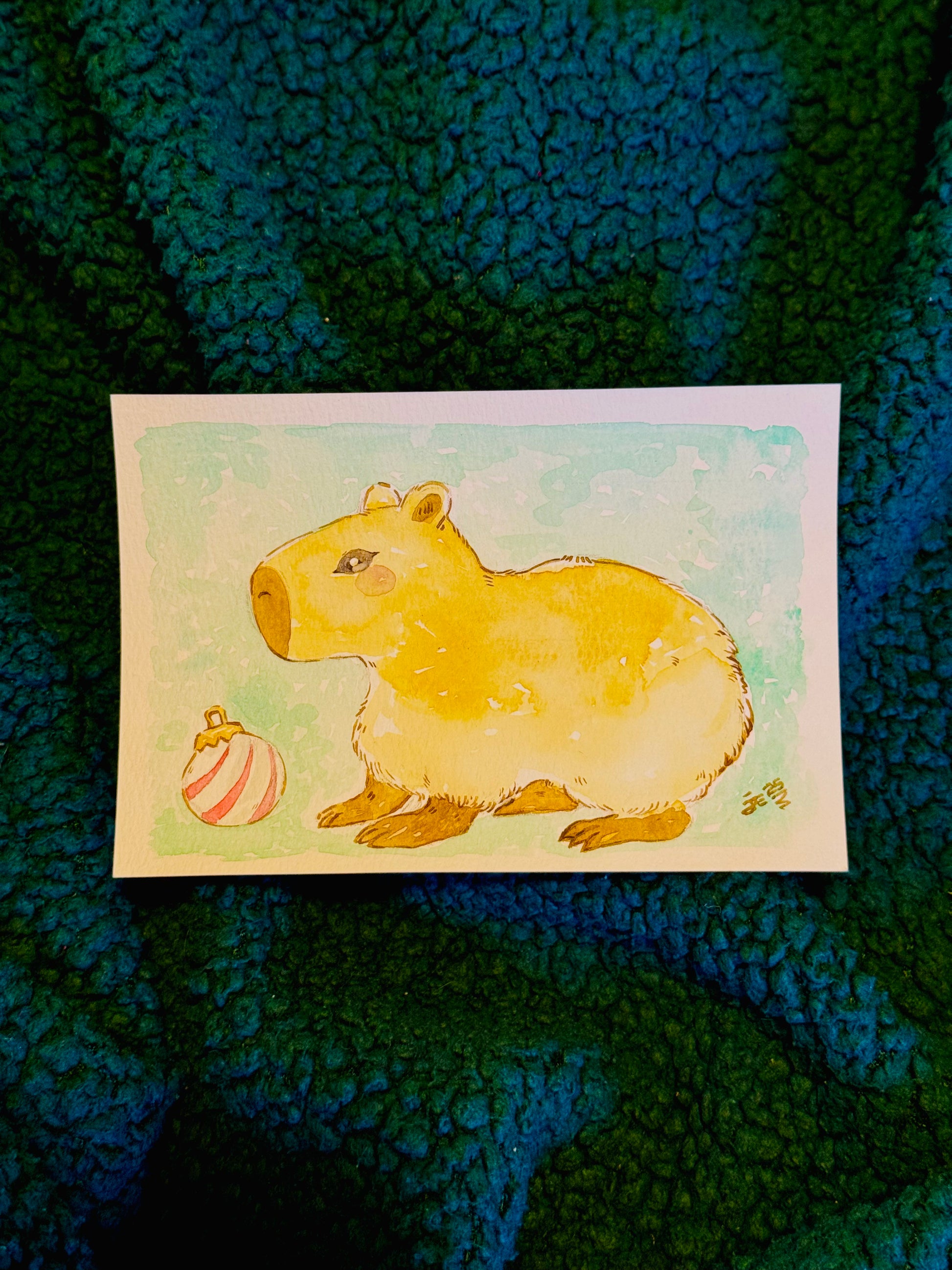 4x6 watercolor artwork featuring a tranquil capybara adorned in a simple Christmas decor. Perfect for gifting or decking the halls with holiday cheer!