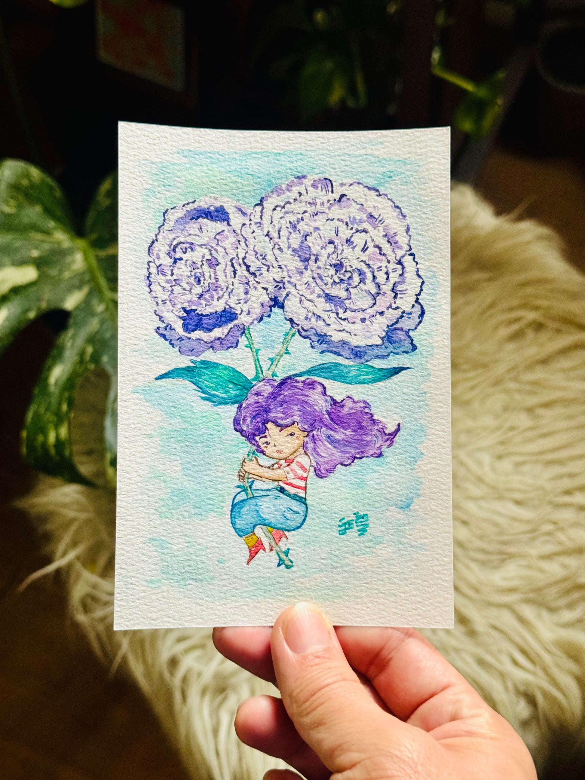 4“x6” watercolor painting depicting a sassy woman who knows her worth being drifted away by two gigantic flowers. A whimsical painting that adds a cute touch to your wall decor or for keepsake.