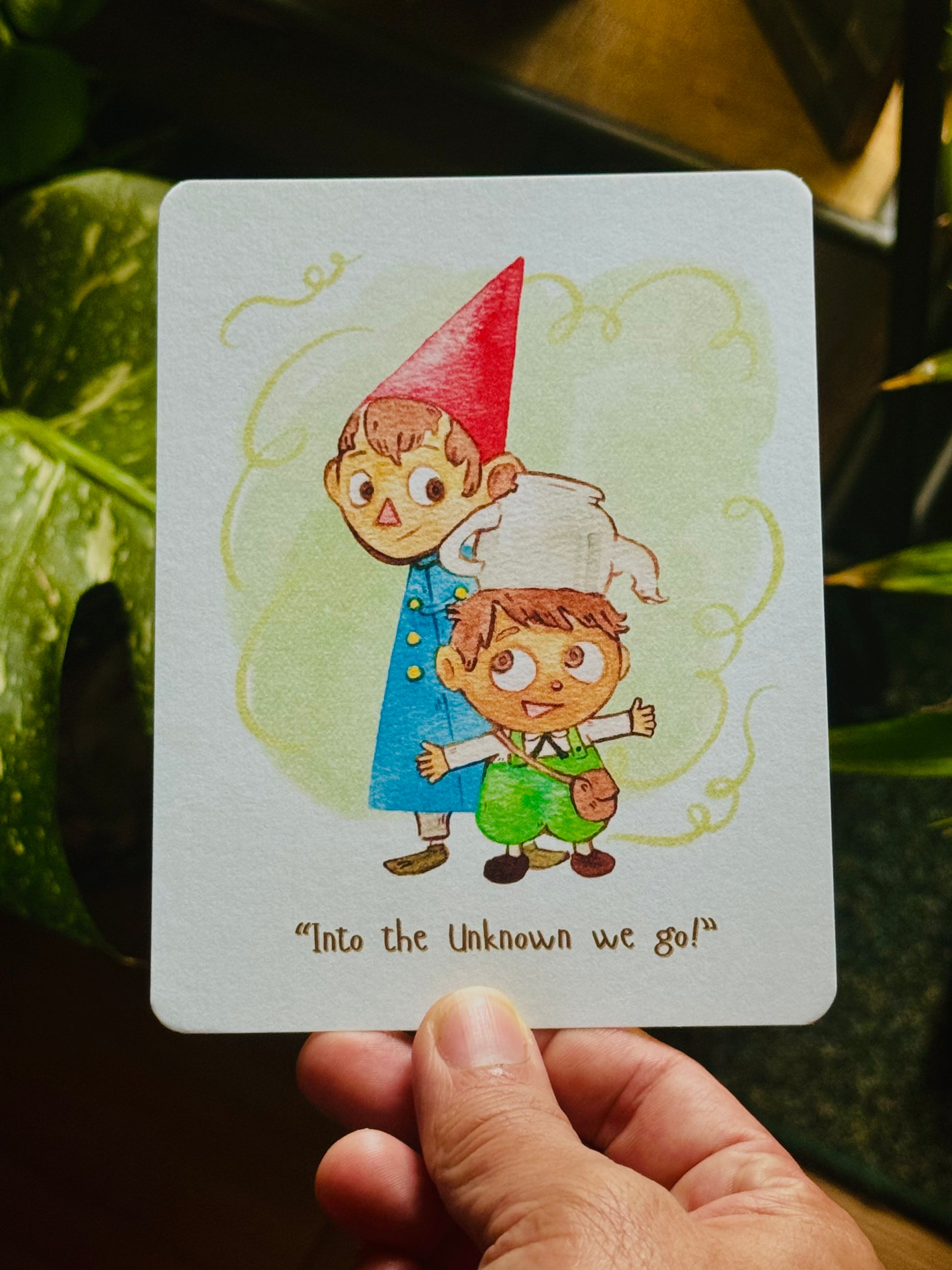 4.3” x 5.5” watercolor print featuring the beloved characters from “Over the Garden Wall”, Wirt and Greg! Get ready to be enchanted by their charming antics captured in this artwork. Perfect for adding character to your study or expanding your art collection.