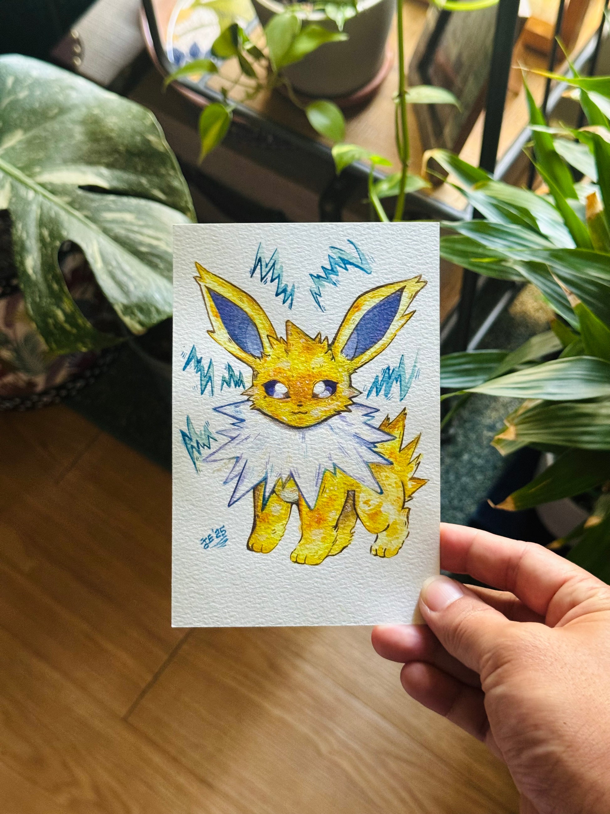 Indulge in this 4x6 watercolor art showcasing the energizing Jolteon ⚡️⚡️ I tried to go for a charming, puppy-esque vibe. I hope I ccaptured the lightning edginess that this creature exudes. This delightful piece is a great addition to your wall decor and Eeveelution lineup!