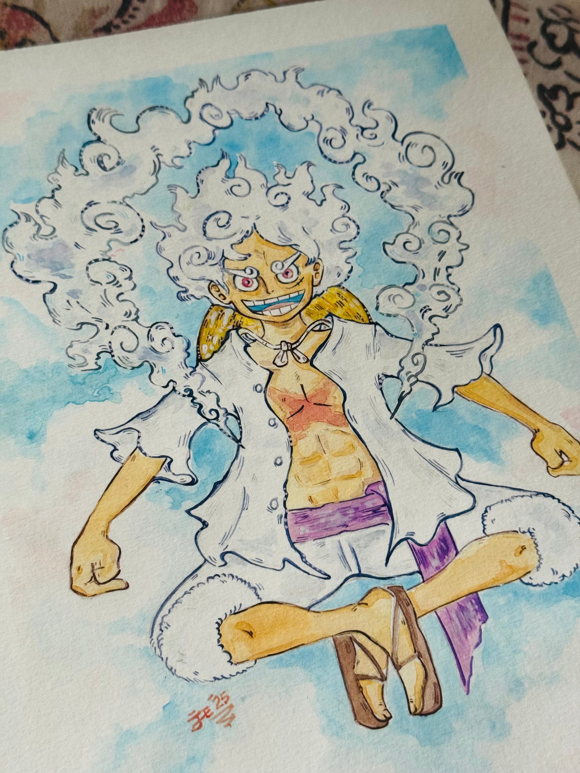 9”x12” original watercolor painting depicting the beloved Luffy from One Piece in one of his higher forms. A whimsical reference to this epic series. A great add on to your fan collection or for wall decor.