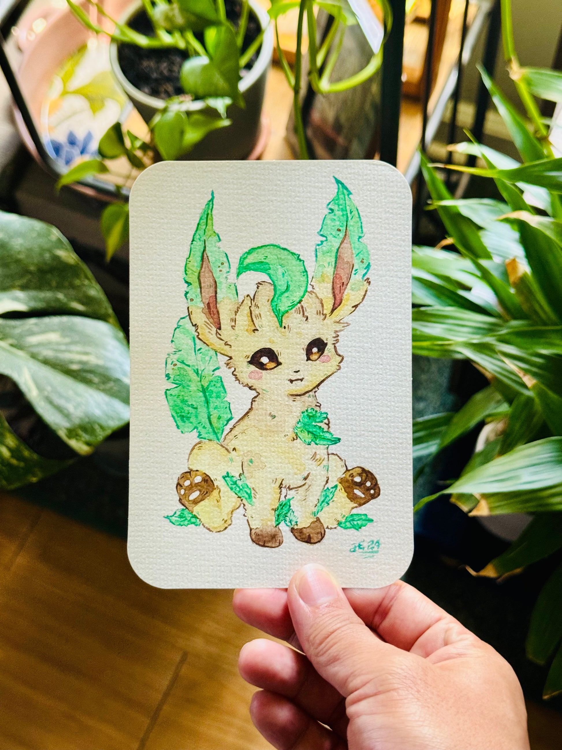 Bring a burst of nature into your home or Pokémon collection with this adorable 4x6" watercolor piece of Leafeon's vibrant energy. A must-have from the Eeveelution line that will surely charm your heart!