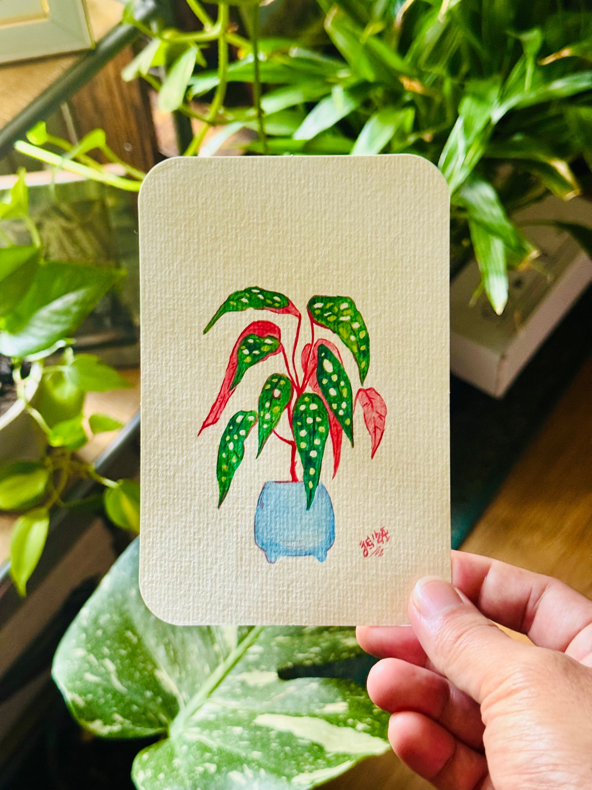 This 4x6” inch painting is perfect for proud plant parents. I took a simple approach and chose a classic: the Polka Dot Begonia (Begonia Maculata). My hope is that this piece exudes the peacefulness and beauty of nature. A fantastic wall decoration for any plant lover's room!