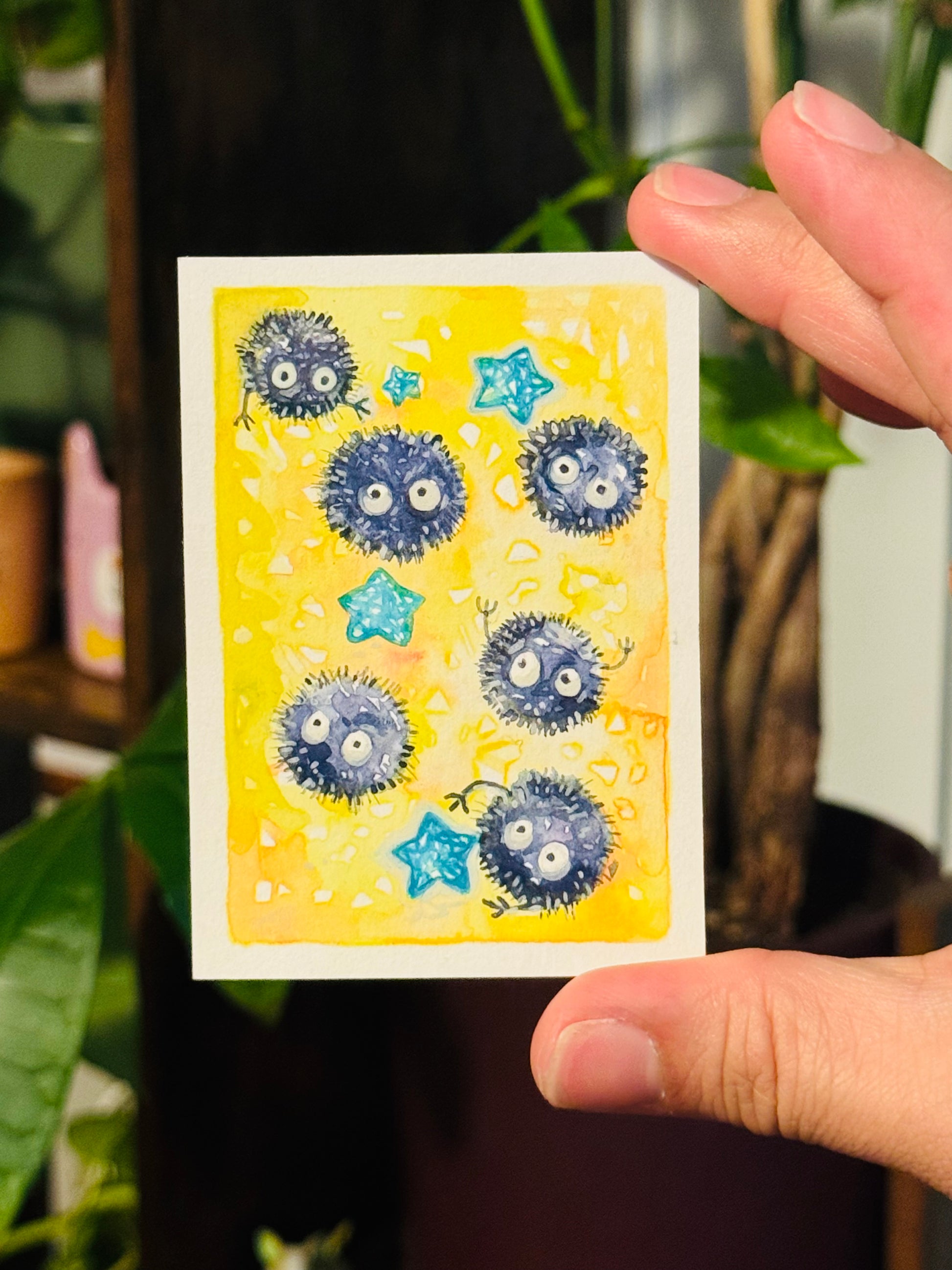 Get your own unique 2.5”x3.5” inch size watercolor creation! Perfect for card collections or for tiny art decor. My painting process is influenced by Miyazaki's universe, the Pokémon realm, the land of Hyrule, and the adventures of Over the Garden Wall. I also draw inspiration from artists like Maruti Bitamin and Stasia Burrington. If that sounds like your cup of tea, send me a request for a commission and I'll happily work with your preferences!