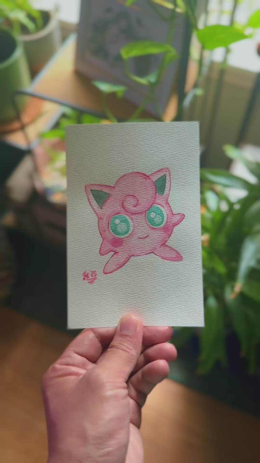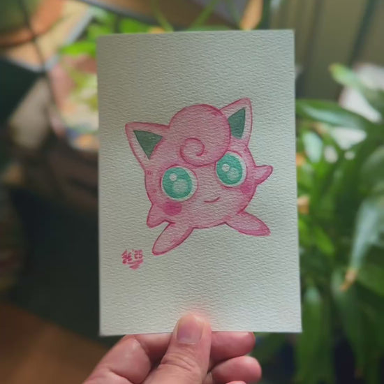 Introduce some playful pink vibes to your art collection with this one-of-a-kind 4”x6” watercolor piece. Featuring the iconic singer-turned-sassy creature, Jigglypuff. A perfect nostalgic touch that will bring joy to any fan of the franchise!